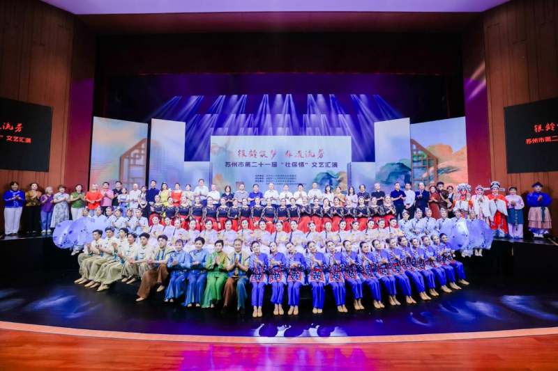 为庆祝中国人民抗日战争暨世界反法西斯战争胜利80周年,迎接苏州市第38个老年节,弘扬中华优秀传统文化,展现退休人员精神风貌,苏州市第二十一届“社保情”文艺汇演于9月25日下午在张家港市城南文体中心群星剧场隆重举行。本次活动以“银龄筑梦 非遗流芳”为主题,由苏州市人力资源和社会保障局主办,张家港市人力资源和社会保障局协办,苏州市社会保险基金管理中心、张家港市企业退休人员社会化管理服务中心承办。
