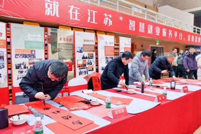 活动现场同步举行了大型招聘会和“春风文润”迎新春文化惠民活动。招聘会现场设置了求职招聘、政策咨询、劳务品牌、重点群体服务、招聘平台推广五大专区,200家用工单位携1.5万个高质量就业岗位参加活动,吸引5000余名劳动者进场求职,现场初步达成就业意向近千人。线上还依托“就在江苏”抖音号和“就在江苏”视频号同步为104家企业开展了直播带岗,在线观看达4.5万人次。文化活动现场,省文旅厅组织艺术家和书法家们以乐传情、以艺献礼、以笔寄意,用精彩的演出和匠心墨宝为到场企业、留岗过节和返乡就业务工人员代表、现场求职者们献上最诚挚的节日祝福。