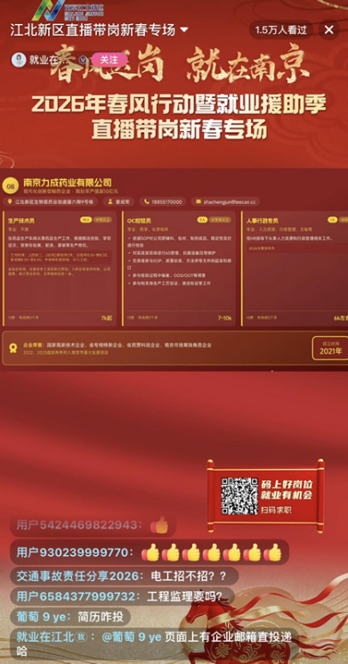 “没有相关工作经验可以投递吗?”“薪资福利具体如何构成?”“工作地点在新区哪个片区?”……2月22日上午,南京江北新区“春风送岗・就在南京”2026年春风行动暨就业援助季直播带岗新春专场火热开播,直播间内提问刷屏、互动热烈。